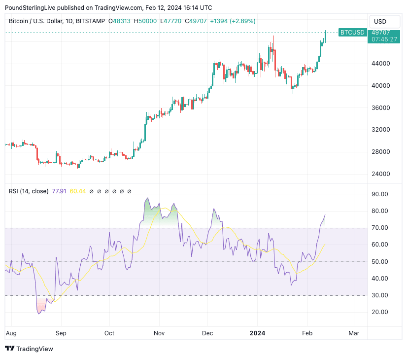 Above: Bitcoin is overbought short-term according to the Relative Strength Index (lower panel).