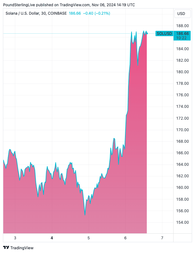Bitcoin has surged by nearly 9% within the past 24 hours, reaching all-time highs, and Solana is up 11%.