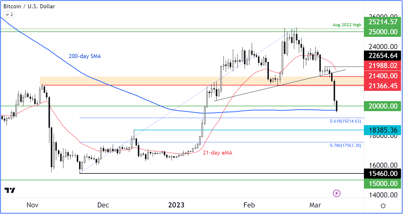 "But crypto assets have been hurt further after Silvergate, a bank that has been at the centre of the industry’s growth, decided to shut down. With BTC/USD breaking lower, we expect any bounces to be short-lived until price starts to form higher highs again," says Razaqzada.