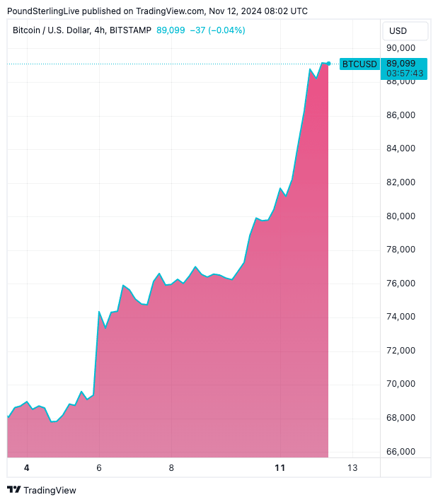 Bitcoin has surged by nearly 9% within the past 24 hours, reaching all-time highs, and Solana is up 11%.