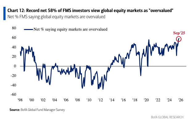 Also, investors recognise that markets are heavily overvalued, with a record 58% of fund managers viewing global equity markets as overvalued, up slightly from 57% in August.