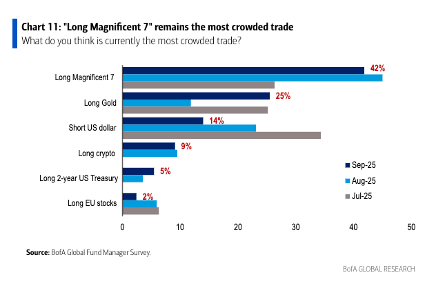 Bank of America's much-watched survey shows the "Long Magnificent 7" remains the most crowded trade for the 2nd month running, according to 42% of investors surveyed.