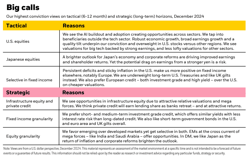 - BlackRock's outlook for 2025 is "risk-on," meaning they are willing to take on more risk to achieve higher returns.