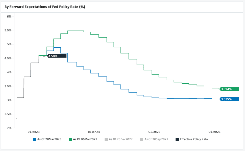 When the Fed issued its latest projections back in December, officials expected rates to end this year above 5% but market pricing currently sees rates at only 4.3% by year-end.