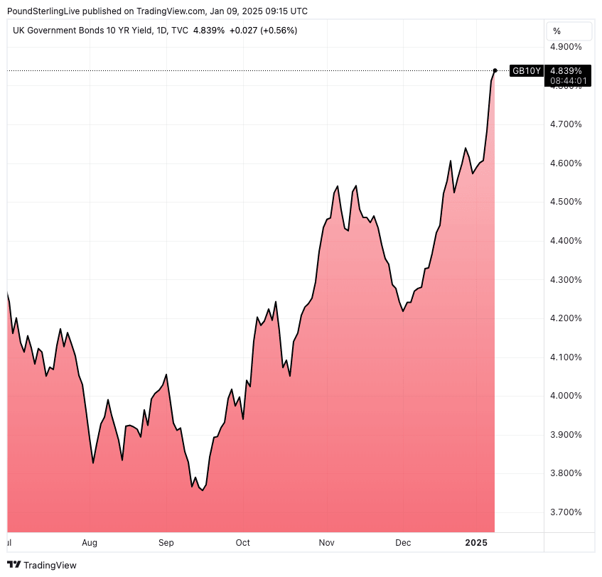 Thursday sees the yield hit 4.839%, a figure last seen in 2001. Crucially, the Pound has fallen against all major currencies.