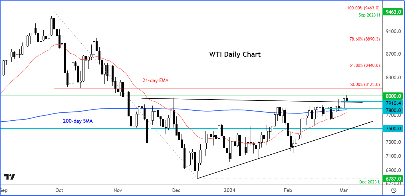The bulls need to hold their ground here to maintain the bullish momentum. If so, WTI could be heading towards the next potential resistance area around $82.00 next.