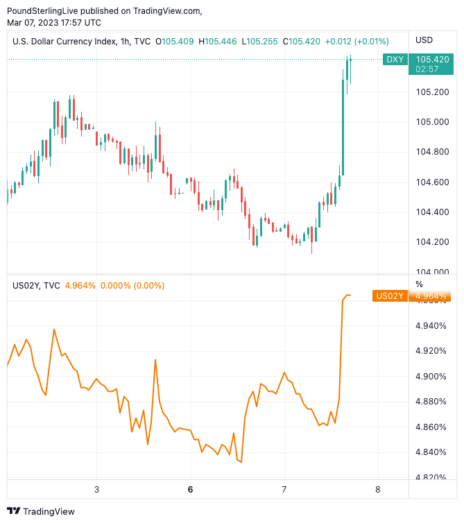 Above: The Dollar index spikes, drawn higher by U.S. two-year bond yields (bottom pane), confirming the bond market is driving FX markets.