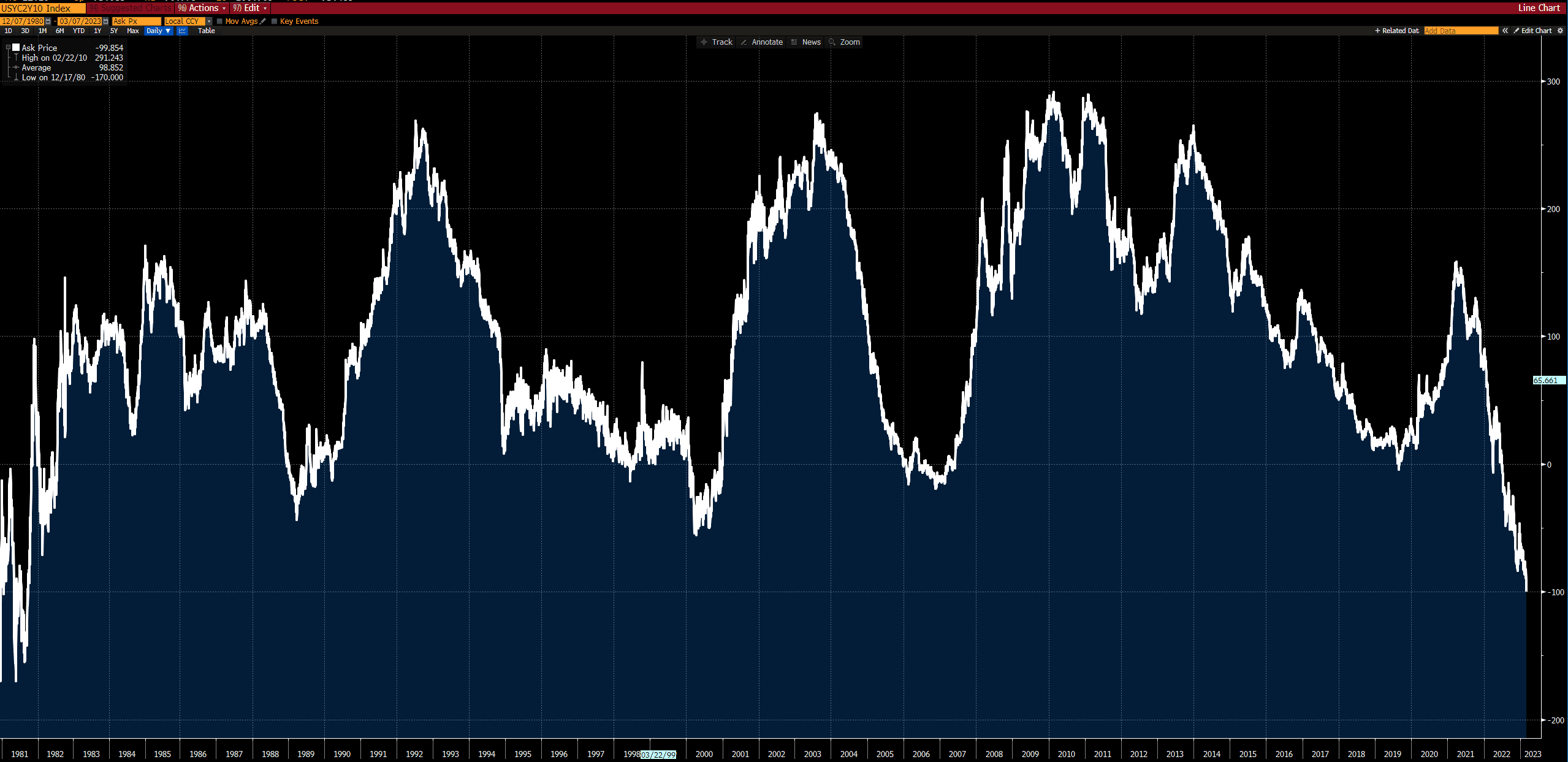 Above: "The 2yr/10yr yield curve is now 100 basis points inverted" - John Authers, Senior Editor at Bloomberg. Image courtesy of @johnauthers / Bloomberg.