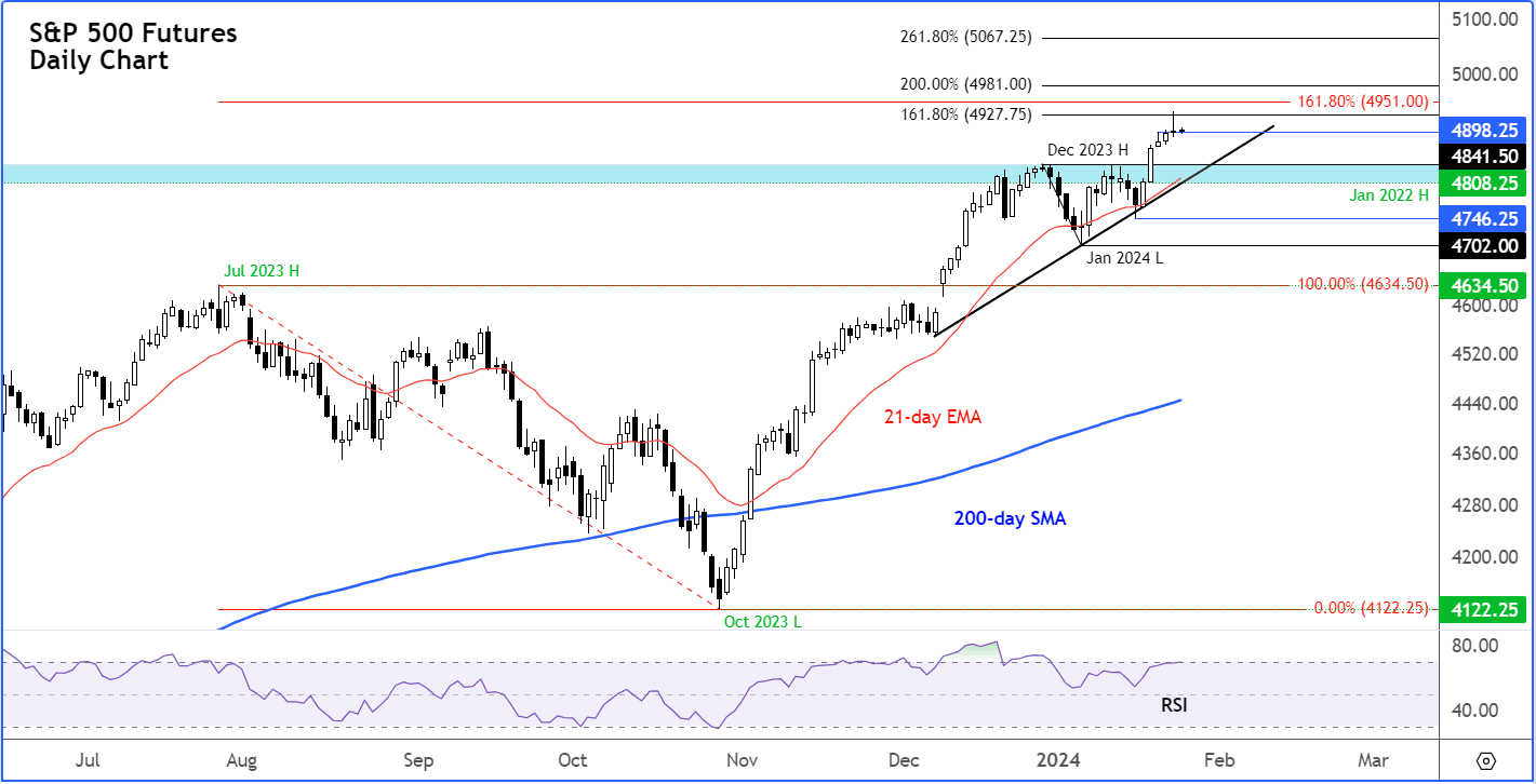 A decisive break below this level could see the S&P drop back to the shaded area on the chart around 4808 to 4841, an area corresponding to the previous two all-time highs hit in January 2022 and December 2023, respectively. Even if the market falls to this area, this won’t necessarily be a bad thing or a sign of a peak.
