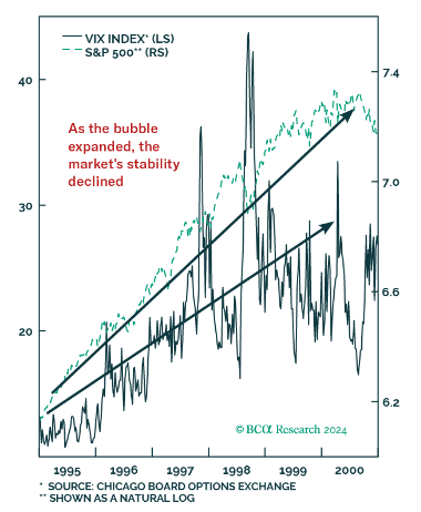 The document points to increased volatility as a hallmark of these late stages, noting that "the VIX averaged 24 in 1999, compared to its level of 14 today." Such elevated levels of market volatility indicate investor sensitivity to potential shifts in monetary policy and economic growth, further contributing to the precariousness of the current market rally.