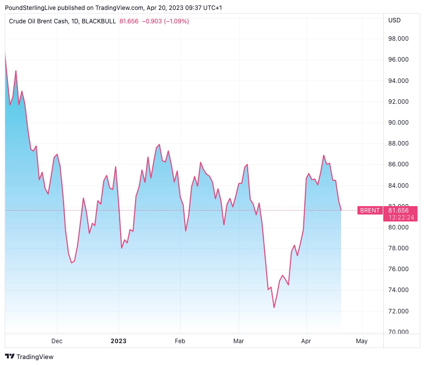 Brent crude falls back towards $82 over worries higher interest rates will dampen global economic growth and future energy demand.