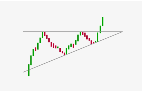 This image shows you the general structure of price action when justifying the buy signal sent by an Ascending Triangle pattern. In reality, the two peaks formed at the upper limit of the triangle don’t have to be of identical heights but only similar ones.