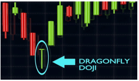 In the context of a downturn in prices, as depicted above, a Dragonfly Doji signals a bullish reversal of the prevailing trend.